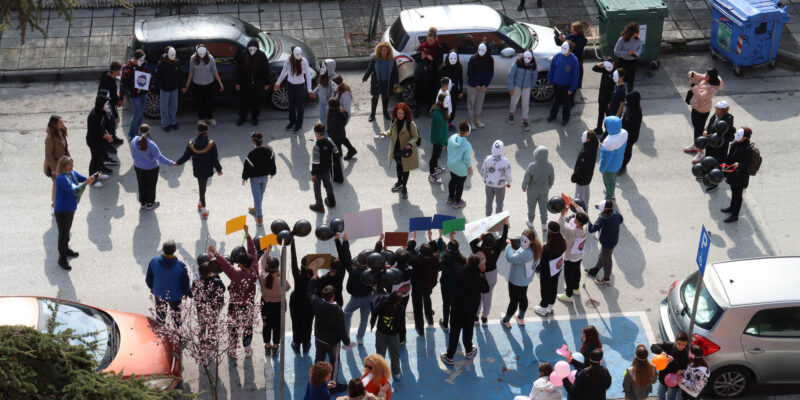 Στο πλαίσιο της δράσης που πρότεινε το Πανεπιστήμιο Ιωαννίνων και υιοθέτησε η Περιφερειακή Διεύθυνση Πρωτοβάθμιας και Δευτεροβάθμιας Εκπαίδευσης Δυτικής Θεσσαλονίκης, οι μαθητές φορούσαν μάσκες οι οποίες απεικονίζουν τα πολλά και διαφορετικά αρνητικά συναισθήματα που συνδέονται με τα φαινόμενα της βίας και του εκφοβισμού.